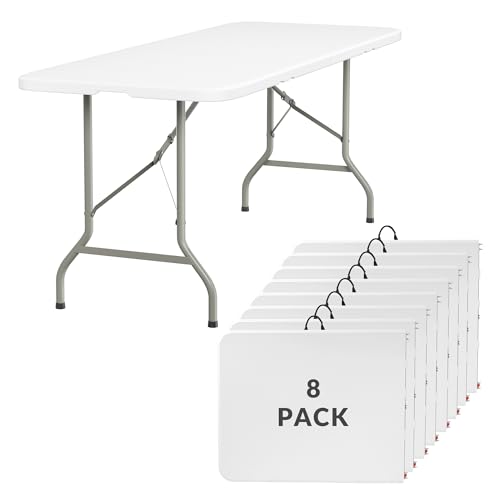 Elevon 6FT Folding Tables – Heavy Duty Portable Foldable Table with Built-in Handle, 300 lb Capacity – Ideal for Events, Parties, Crafts, Camping & Dining (8-Pack)