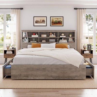 Qeetex - King Platform Bed with Storage Bookcase Headboard & 4 Drawers, Strong Metal Frame, Noise-Free Design - Gray
