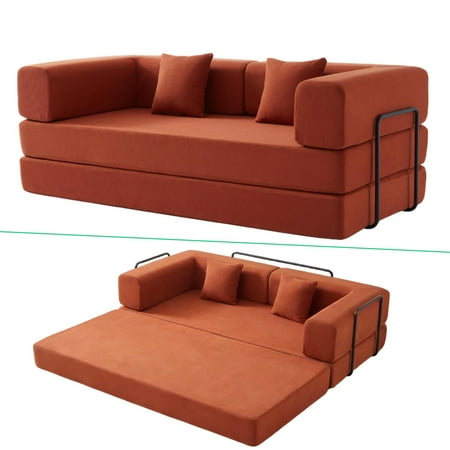 Aukfa 79 Chaise Futon King Size Convertible Sleeper Sofa with Fixed Frame 2 Pillows Corduroy Orange-red