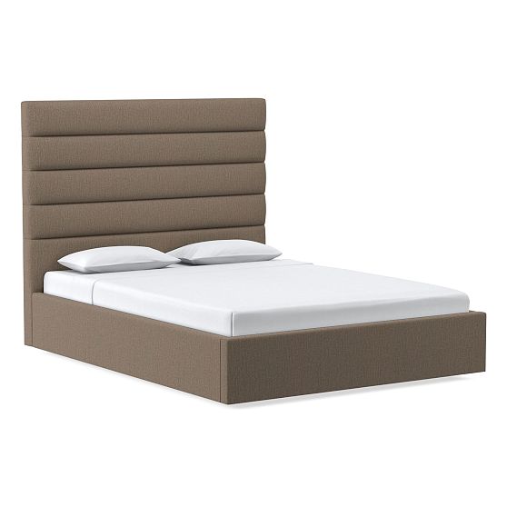 Emmett Low Profile Bed, Horizontal Tufted, Tall Headboard, Perf Chen Basketweave, Taupe, No-Show Leg, Queen