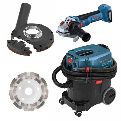 Bosch GWS18V-10N 18V Brushless 4-1/2 – 5 In. Angle Grinder (Bare Tool), 18SG-5E 5 In. Surface Grinding Guard, VAC090AH 9 Gallon Dust Extractor, and